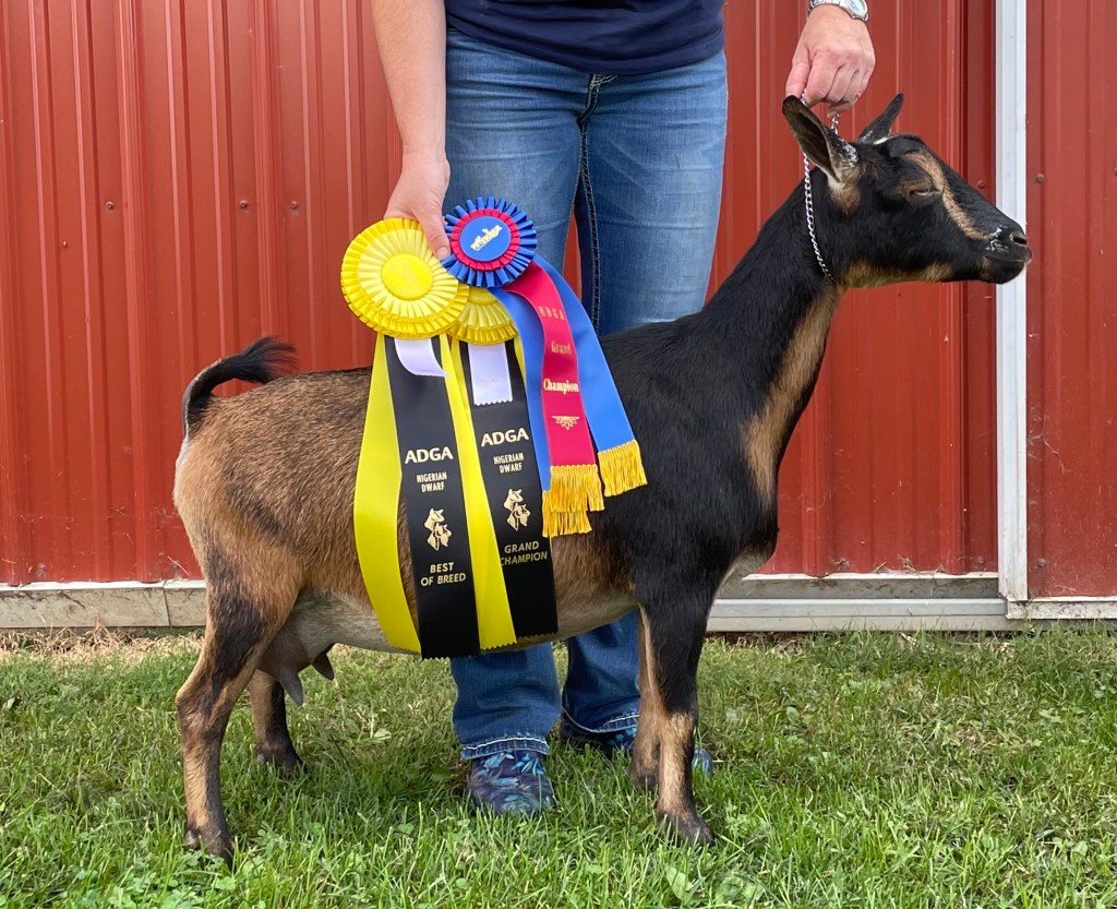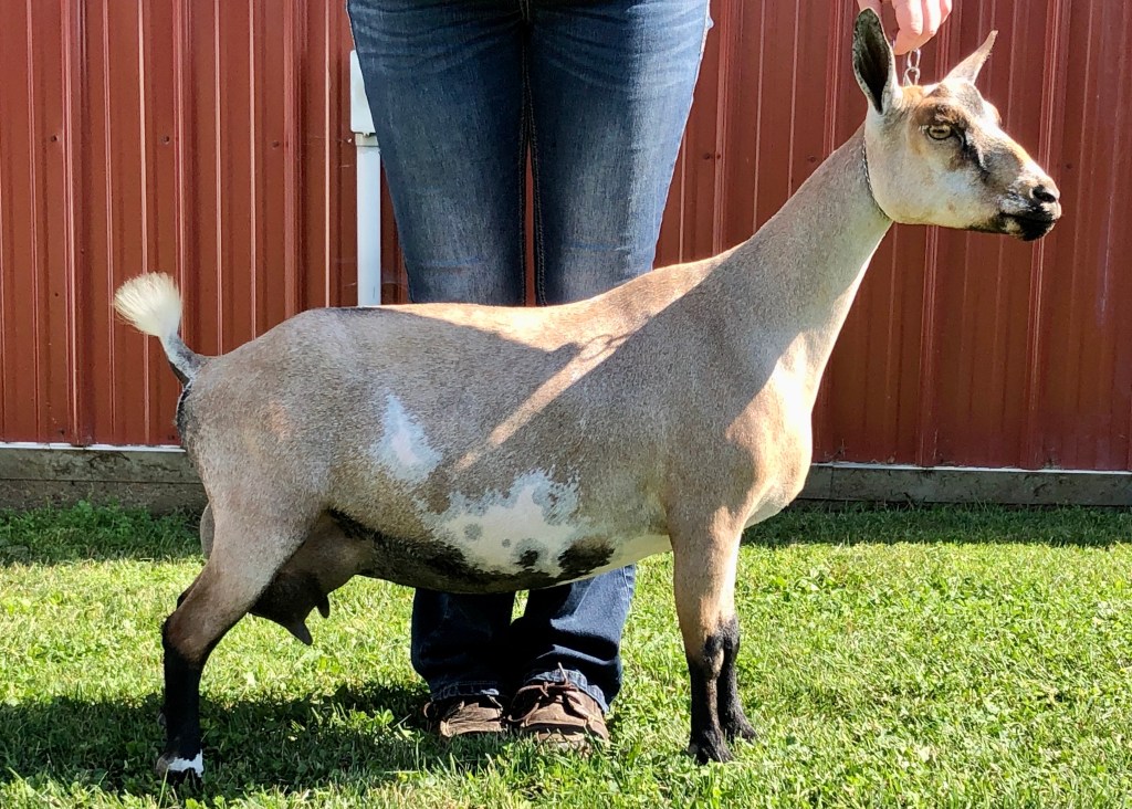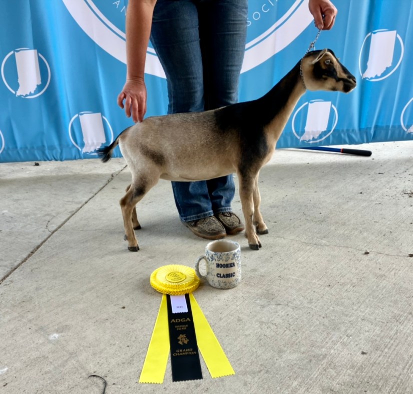 SHOW RECORD: 2019- BANKS OF THE WABASH CLASSIC- ADGA- RING-1- RESERVE GRAND CHAMPION JUNIOR DOE; HOOSIER CLASSIC- ADGA- RING A- GRAND CHAMPION JUNIOR DOE; 2020 MONTGOMERY COUNTY, IN 4-H FAIR RESERVE GRAND CHAMPION JUNIOR DAIRY DOE; MONTGOMERY CO., INDIANA 4-H 2021 RESERVE GRAND CHAMPION SENIOR DAIRY DOE; 2021 GOATBUSTERS NDGA SHOW- GRAND CHAMPION SR DOE (IN MILK) RING 1; 2021 GOATBUSTERS ADGA SHOW- GRAND CHAMPION SR DOE & BEST OF BREED (RING 3); 2022 MONTGOMERY COUNTY 4-H, IN GRAND CHAMPION SR DAIRY DOE